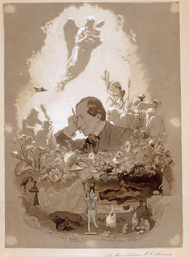 ![]() | HCA/A-235 | "H.C. Andersen omgivet af figurer fra sine eventyr". Tegning af August Malmström (1829-1901), 1863 | Tegningen, der er dedikeret med ordene "Ligemed Sigurd Fafnersbane kjendte han naturens Sprog", blev lavet af den svenske maler A. Malmström i anledning af skandinavernes fest for H.C. Andersen i Paris den 11. Marts 1863. "Klokken 8 til aften kom een af de svenske Herrer med Vogn og afhentede mig til en Restauration i Palais royal, der var henved 60 Skandinaver, Bordet stod dækket med Blomster og Thee. I Enden af Salen var et stort Billed forestillende mig sidde og læse og rundt om var mærkeligt sammentrængt given en Deel af mine Eventyr, over mig svævede 'Engelen' med Barnet, en lille Ameorin hvidskede mig noget i Øret, Reisekammeraten forfulgte Prindssessen, der stod Svinemoder med den lille Griis med Krøllen paa Halen, de vilde Svaner. Sommerfuglen. Den grimme Ælling. Musene og Musekongen der stak sin Hale i Gryden, Rosenhækken og Sneglen og allerforrest den standhaftige Tinsoldat." Dagbogen den 11. Marts 1863 |