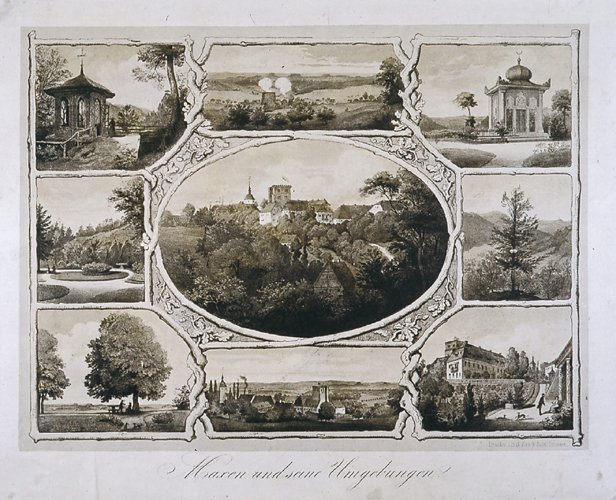 ![]() | HCA/XII-9 | "Maxen og dets omgivelser", litografi, 1855 | I familien Serres gæstfrie hjem - på herregården Maxen sydvest for Dresden - samledes hver sommer prominente forfattere, kunstnere og musikere, heriblandt også H.C. Andersen, der opholdt sig dér i lange perioder mellem 1844 og 1869. I litografiets midterste felt til højre ses digterens træ. "Jeg var nogen Tid paa Landet, nogle Miil fra Dresden, hos en riig Familie, der holder af mig, da jeg for 7 Aar siden var der sidst, gik jeg med Fruen hen ad Fjeldveien; der laae henkastet et lille knækket Fyrretræ, men det havde Rod, jeg bandt Træet sammen, gik ud paa en Skrænt hvor der i Klipperevnen var lidt Jord og plantede det. - Fruen har pleiet og opelsket dette Træ, i syv Aar er det skudt op og blevet tre Gange saa langt, som jeg, og har baaret en Plade med Indskrift: "Den danske Digters Træ". Under Krigen havde Mange spurgt 'hvad er det?' - Forrige Aar var det imidlertid kommet til at mit Træ ved sin stærke Væxt kom i Berørelse med en stor kraftig Birk ... mit Træ vilde blive forkuet, og tænk - da slaaer Lynilden ned, splintrer Birketræet, nu ses kun dets Stub, og det danske Træ stod og staaer frit, svaiende for Vinden, høit over den bratte Afgrund. Tilfældet har virkelig sin Poesie." H.C. Andersen i brev til Henriette Wulff den 24. september 1851 |