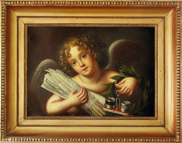![]() | HCA/XV-17 | "Englebarn", maleri af Mariane Frederikke Stub (1790-1842), 1832 | Maleriet, der hang over H.C. Andersens skrivebord, modtog han i 1832 af malerinden Mariane Frederikke Stub. Hun var moster til digterens ungdomsven Ludvig Müller (1809-91). "De yttrede i Deres Brev, at De havde i Sinde at glæde mig med et lille Malerie. O, De vilde gjøre mig lykkelig dermed! - Jeg sagde for Spøg til Ludvig, "jeg vil bede hende male mig en Engel med dit Ansigt!" Der skulde De see, hvor han blev lidenskabelig, skjøndt jeg bemærkede at Ansigtet maatte være qvindligt. Han truede da med at ødelægge det, hvis han fik det at see. Den lille Nar! Han kan jo ikke vide om jeg tænker mig et qvindligt Væsen og slet ikke ham, som jeg paa denne Maade vil faae et Portræt af. - Jeg har ogsaa drillet ham, men der er ingen Udveie med ham. - Alvorligt talt, De vil gjøre mig meget glad om jeg faaer et Stykke, kun som Qvadratet af dette Brev. De kan jo male Ludvig som en garstig Recensent med fæle kløer, eller give mig et andet godt lille Barn, der kan see lidt mildt til mig, naar Verden udenfor kaster for onde Øine eller støder mig reent fra sig". H.C. Andersen i brev til Mariane Frederikke Stub 14. december 1832 |