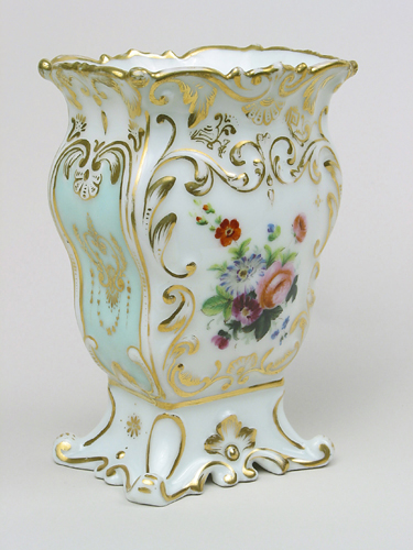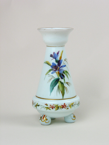 ![]() | HCA/XIII-71 | Vase | Vase af hvidt glas med påmalede blomster og tre kugleformede ben. |