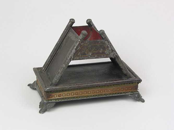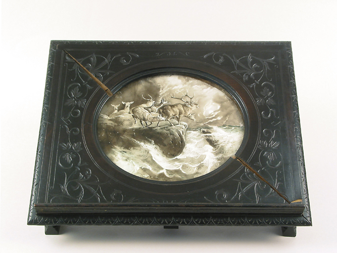 ![]() | HCA/XIII-41 | Læsepult | Læsepult af træ med ovalt billede i midten, der forestiller brølende hjorte på en klippe i havet under en uvejrshimmel. Efter H.C. Andersens død har læsepulten været i biskop Engelstofts (1805-89) eje. Engelstoft var var biskop over Fyns Stift og nær ven til digteren. Han holdt bl.a. talen ved afsløringen af mindepladen på H.C. Anderens Barndomshjem 2. April 1875 og talte ved digterens begravelse i Vor Frue Kirke den 11. August 1875. |