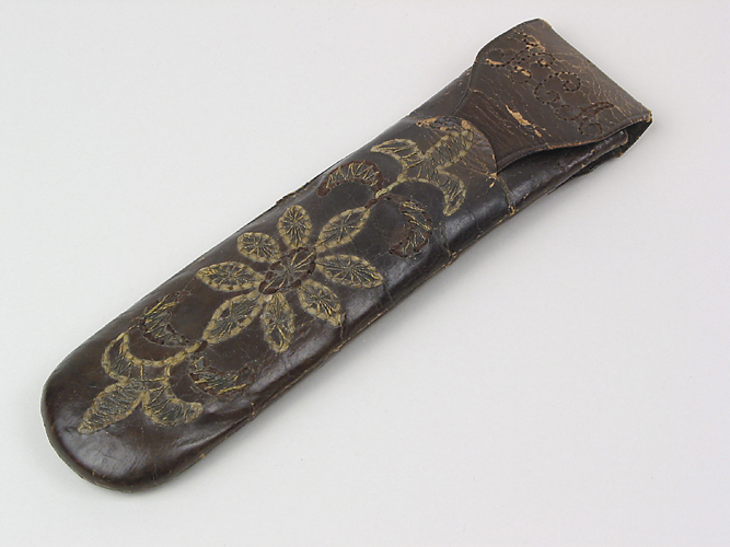 ![]() | HCA/XIII-90 | Brillefoderal | Brillefoderal, brunt skind med broderede blomster og initialerne "HCA" |