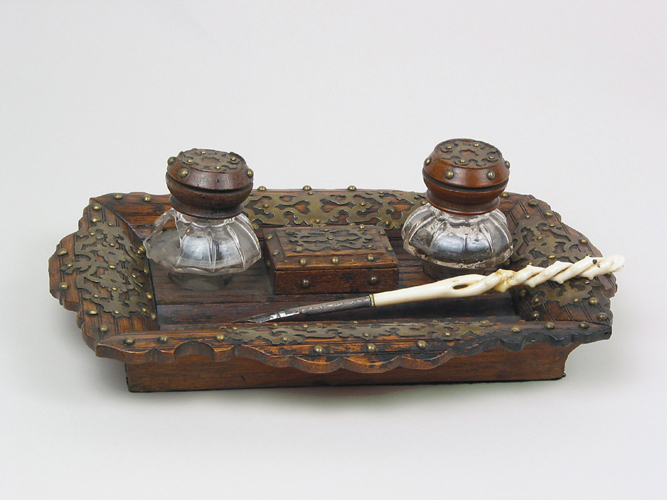 ![]() | HCA/XIII-85 | Træbakke med to blækhuse | Messingornamenteret træbakke med glasblækhuse samt lille æske med låg. H.C. Andersen siges at have brugt skrivesættet i mange år. I 1863 modtog Steen Andersen Bille (1862-1922) bakken med skrivegrejet i faddergave af digteren. Forfatteren og skuespilleren Elith Reumert (1855-1934) har senere været ejer af sættet. |