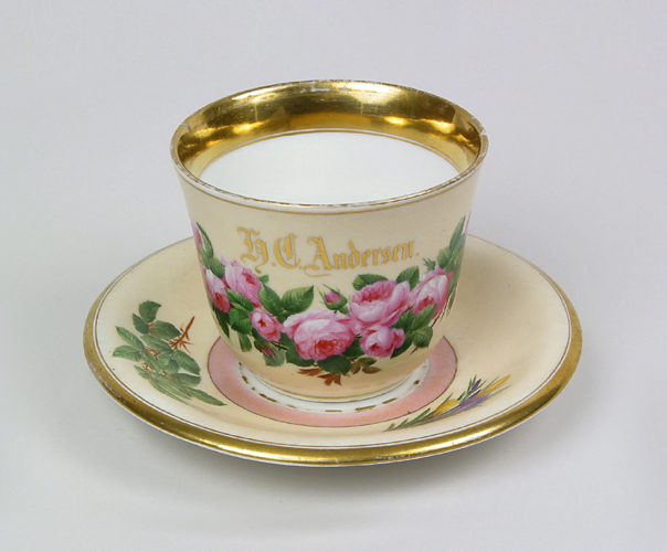![]() | HCA/A-806 | Dekoreret porcelænskop | Porcelænskoppen, der bærer H.C. Andersens navn og fødselsdato, synes at være en fødselsdaggave fra Henriette Melchior (1813-92), der har dekoreret koppen givetvis i samarbejde med sin lærer Chr. L. Klein (1810-91), som var blomstermaler ved Den Kgl. Porcelainsfabrik i København. |
