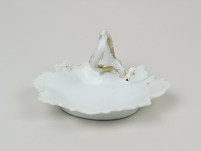 ![]() | HCA/XIII-93 | Hvidt porcelænsaskebæger | Lille porcelænsskål formet som et blad, med et håndtag dekoreret med vedbendblade-ornamenter. Købt i 1926 af enkefru Dolleris, som oplyser, at den har tilhørt H.C. Andersen. Muligvis er der tale om den julegave, H.C. Andersen modtog af lensgrevinde Mimi Holstein, f. Zahrtmann (1830-76) i 1866. I et brev til Jonna Stampe skriver H.C. Andersen 29.12.1866 (VI-62-0021), at han "fik mine Presenter, selv fra Holsteinborg, fra Grevinden en nydelig Skaal til Nips, den forestiller en Dam, Hanken er en Stork ved Dammen". |