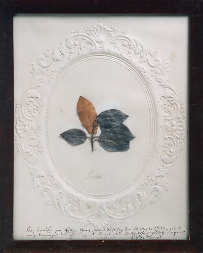 ![]() | HCA/XVI-23 | Karton med pressede blade. | H.C. Andersens egenhændige inskription lyder: "Fra Krandsen paa Goethes Grav, hans Dødsdag den 22. marts 1832, givet mig Aaringer derefter og nu bragt fru D. Melchior, f. Henriques. H.C. Andersen". "Gaaet med Kansler Müller til »Die Fürsten Gruft«, Kirkegaarden er meget venlig med Blomster, og Udsigt over Byen. I Kapellet ere Kisterne nu flyttede om, Göthe og Schiller staae ved Siden af hinanden, jeg vilde gaae til Göthes Kiste og det var Schillers jeg lænede mig over. Jeg stod mellem dem begge læste mit Fader vor, bad Gud lade mig blive en Digter dem værdig og iøvrigt i Ondt og Godt hans Villie skee, paa Kisterne laae Laurbærkrandse, jeg tog Blade fra hver." Dagbogen den 29. juni 1844 |