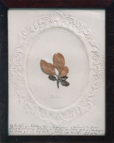 ![]() | HCA/XVI-22 | Karton med pressede Blade | Under bladene står anført: "Af Krandsen paa Schillers Kiste i Fyrstegraven i Weimar, den store Digters hundredaarige Fødselsdag den 10. November 1859. Maleren Amberger fra Basel gav mig disse Blade og Schiller nye Krandse. H.C.Andersen". H.C. Andersen synes at have fået denne suvenir i 1860. I sin dagbog skriver han: "Amberg gav mig sit Portræt og to Mindeblade om Göthe og Schiller" Dagbogen den 21. september 1860 |