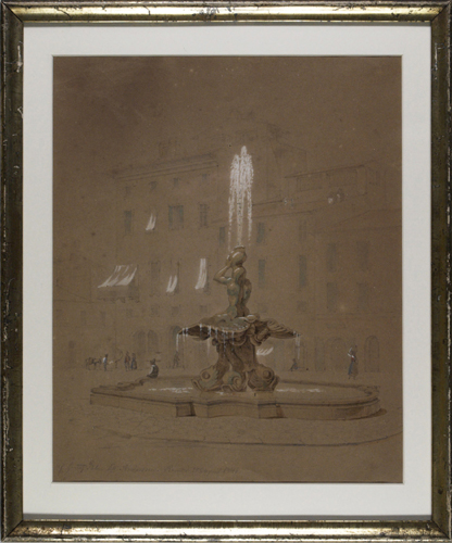![]() | HCA/XV-6 | "Piazza Barberini i Rom", akvarel af den svenske maler Gustav Palm (1810-90), 1846 | Afskedsgave fra Gustav Palm til H.C. Andersen den 28. April 1846, da H.C. Andersen skulle forlade Rom. "Hvo der har været i Rom, kjender godt Piazza Barberina, den store Plads med den smukke Fontaine, hvor Tritonen tømmer den sprudlende Muslingskal, hvorfra Vandet springer flere Alen iveiret; hvo som ikke har været der, kjender den dog af Kobberstik; kun Skade, at paa disse staaer ikke Hjørnehuset til Via felice, det høie Hjørnehuus, hvor Vandet strømmer gjennem tre Rør udaf Muren og ned i Steenbasinet. - Det Huus har en egen Interesse for mig, thi der blev jeg født." Improvisatoren [1835] |