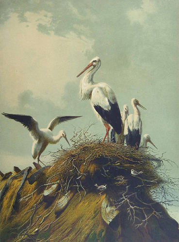 ![]() | HCA/1959/23 | "En Storkerede". Farvelitografi Adolf Mackeprang (1833-1911) | Storken havde H.C. Andersen en særlig kærlighed til, og litografiet hang derfor over digterens skrivebord. "Frøken Hallager kom styrtende ind,: 'De faae meget fornem Visit: Kongen og Prinds Waldemar!' jeg troede det ikke og bar ihast en Deel af Overtøiet, jeg skulde have paa ind i Soveværelset; da aabnedes Døren og Kongen med Valdemar traadte ind. 'Jeg har længe tænkt paa at vilde besøge Dem! sagde han, min Søn har været her nogle Gange!' jeg blev bevæget, Taarerne kom i mine Øine, han trykkede venligt min Haand og udtalte at jeg saa mere vel ud end han havde troet, at det at jeg var uden Tænder, klædte mig langt bedre end de kunstige jeg havde baaret … Han bragte mig Hilsener fra Dronningen, jeg viiste ham enkelte af Billederne paa min Væg; han spurgte om Skizzen til Blochs Osterie og til Mackeprangs Storke." Dagbogen den 23. februar 1873 |