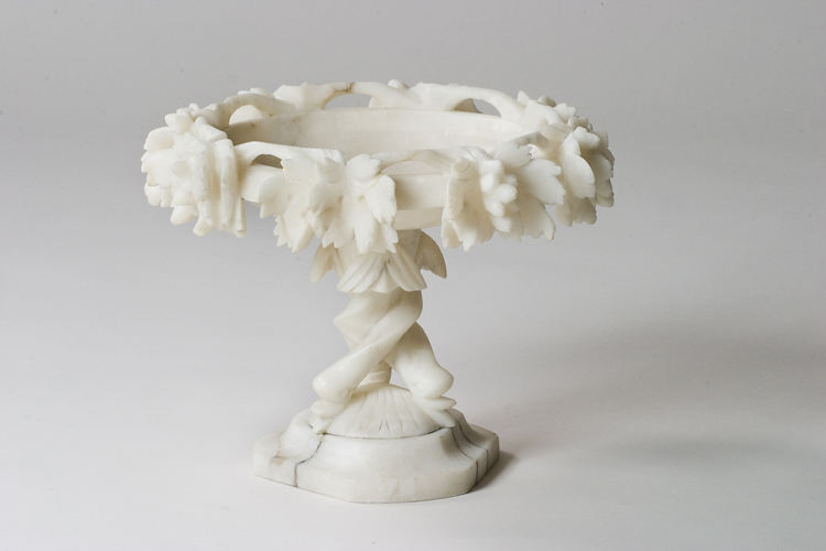 ![]() | HCA/1948/35 | Hvid opsats | Opsats af alabast med en flad skål, der langs randen er dekoreret med parvist anbragte vinblade og vindruer. 'Søjlen' eller 'stilken', der bærer skålen udgøres af tre fisk eller marsvin med sammenslyngede haler. Denne type opsatser blev som regel anvendt til at lægge visitkort i. |