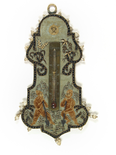 ![]() | HCA/XIII-69 | Termometer, broderet. | Reaumur-termometer anbragt på en baggrund af blå silke med forskelligt perlebroderi; øverst en sol med vrede ansigtstræk, forneden to pelsklædte mennesker. "Frøken Bjerring bragte mig i Dag et lille broderet Thermometer." Dagbogen 2. april 1874 |