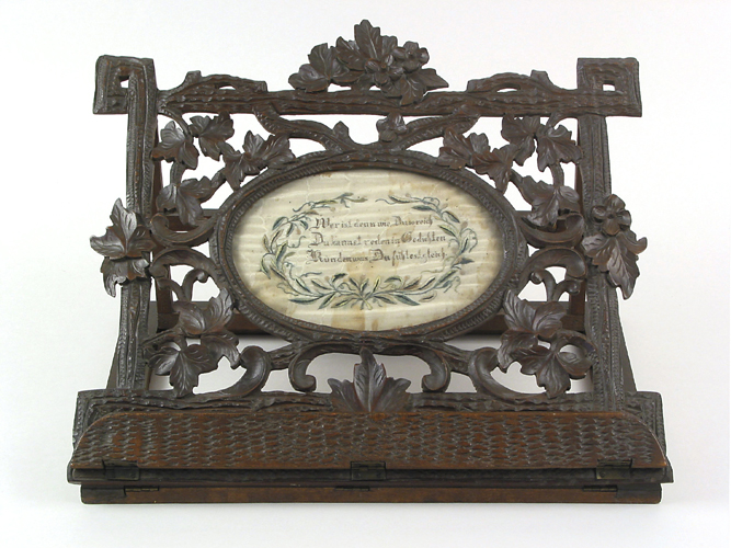 ![]() | HCA/XIII-40 | Læsepult udskåret som egeløv | Læsepult, udskåret som egeløv. I midten en oval plade med broderet indskrift: 'Wer ist denn wie Du so reich - Du kannst reden in Gedichten Künden was du fühlest Gleich'. På bagsiden et stativ, der gør rammen stilbar, så den danner en skrå pult. Langs forkanten forneden en flad liste. På bagsiden er med blæk skrevet, at pulten har tilhørt H.C. Andersen og "blev daglig benyttet af ham", endvidere årstallet '1875' samt navnet 'Melchior'. |