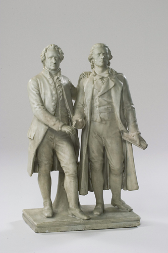 ![]() | HCA/1961/36 | "Goethe og Schiller", statuette efter Ernst Rietschels (1804-61) mindesmærke på Theaterplaz i Weimar | Statuetten i kalipasta modtog H.C. Andersen af veninden Friederike Serre, f. Hammerdörfer (1800-72) i fødselsdagsgave 1859. To år tidligere havde H.C. Andersen overværet afsløringen af mindesmærket foran Nationalteatret i Weimar. "... en ung Officeer førte mig gjennem Mængden til Dr Ulmanns Huus, her traf jeg Liszt med Fyrstinde Wittgenstein og Prindsesse Maria. Det var et stort Moment da Sløret faldt for Digter Gruppen Schiller og Goethe, Schiller ligner mig. Paa Storhertugens Tribune var Fru Göthe med Sønnerne, den unge Gleichen og Schiller; da jeg siden gik ned i Gaden fløi om Digternes Hoved en hvid Sommerfugl, det var som om den var uvis paa hvem den skulde sætte sig." Dagbogen den 4. September 1857 |